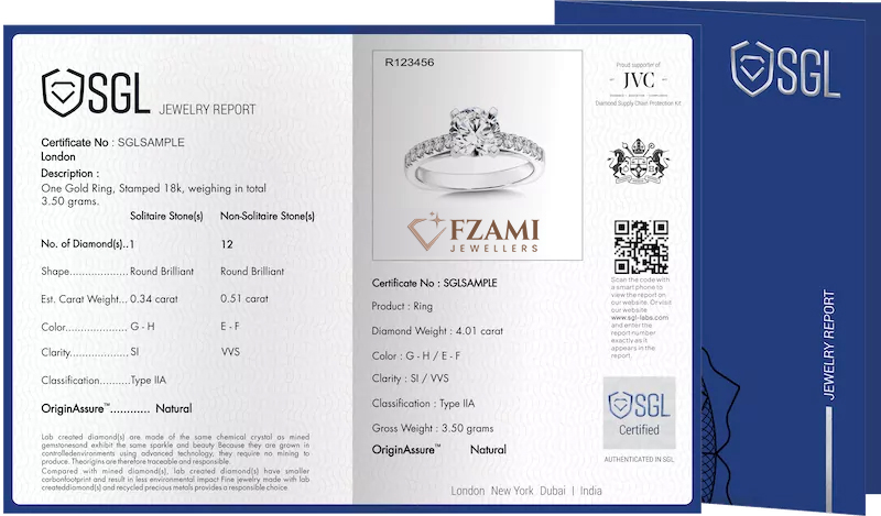 Our jewellery is certified by SGL - Solitaire Gemological Labs, an Indian origin but world-renowned diamond grading and certifying organisation with the second largest lab network in the world.